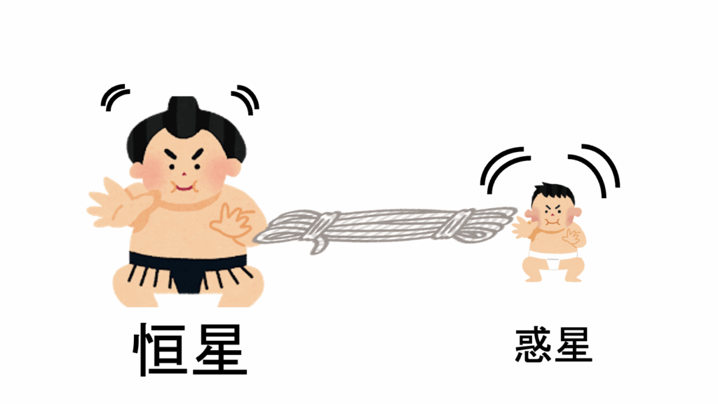 一つ目は視線速度法です。惑星は恒星の周りを公転していますが、なぜ恒星を振り切って外に飛んでいかないかというと、重力により恒星に引きつけられているからです。実は同じように恒星自身も惑星の重力により引きつけられており、それによってほんの少しだけ揺すられます。例えるならお相撲さんと子供が綱引きをして、お相撲さんがちょっと揺れるようなものです。