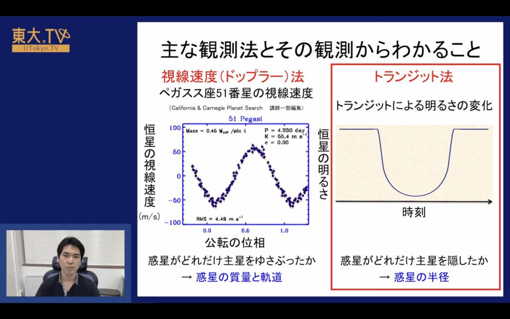少し難しかったかもしれませんが、とりあえず恒星が惑星の重力の影響でふらつき、それを検出するのが視線速度法だと覚えてもらえれば大丈夫です。